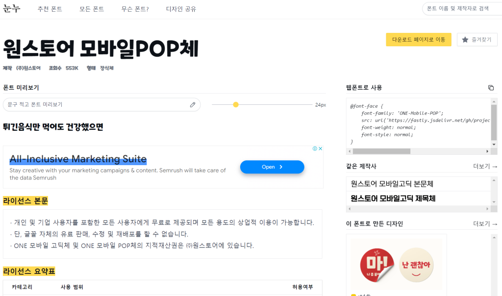 마음에 드는 폰트를 클릭하면 아래와 같이 폰트 상세 페이지로 이동할 수 있습니다.