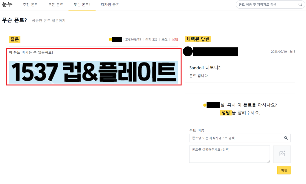 네이버의 지식IN과 같은 시스템으로, 폰트 정보를 눈누 내 커뮤니티 사람들에게 질문하는 형식인데요.